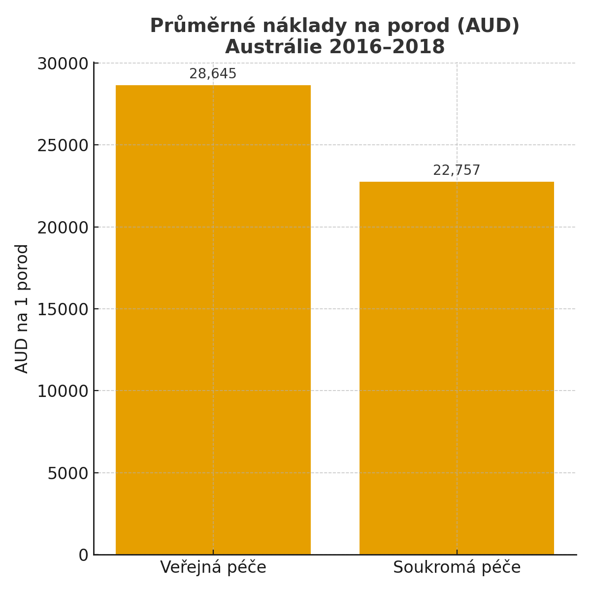 Náklady: Průměrné náklady na jedno těhotenství a porod byly o 5 929 AUD vyšší ve veřejné péči. Pokud by ženy přešly ze soukromé do veřejné péče, znamenalo by to ročně o 1,77 miliardy AUD více pro vládní plátce.